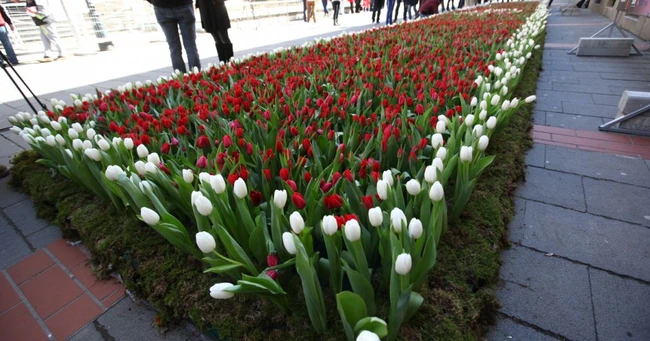 Cum arată primul covor de flori din România. Acesta a fost expus în centrul Bucureştiului şi este realizat din 15.000 de lalele