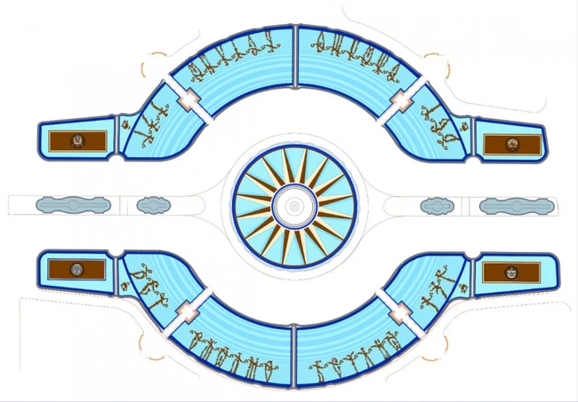 De asemenea, pentru mozaicul fântânii centrale din ansamblu s-a optat pentru reprezentarea vizuală a Soarelui, element prezent în toate culturile strămoşilor românilor, fie ei daci, romani sau greco-bizantini.