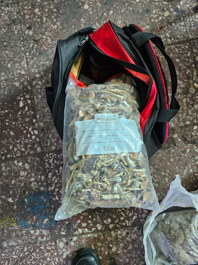 La perchezițiile efectuate în apartamentul traficantului în seara aceleiași zile, anchetatorii au găsit o „farmacie” și un depozit de droguri: 500 de grame canabis, 70 de grame substanță psihoactivă, 80 grame amfetamină, 7 timbre LSD, 43 comprimate ecstasy, 16 comprimate MDMA, 1 gram hașiș, 8 comprimate tramadol, 60 grame de ciuperci psilocybe, grindere și mai multe cântare electronice de precizie și suma de aproape 62.000 de lei. Mai trebuie spus că cele 16 comprimate MDMA erau inscripționate cu logo-ul „La Casa de Papel”.