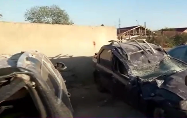 În imaginile difuzate de sursa citată, pe scaunele uneia dintre mașini se poate observa o bucată din peretele blocului.
