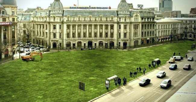 FOTO Bucureşti, variantă îmbunătăţită. Cum arată Piaţa Universităţii acoperită cu un covor de iarbă
