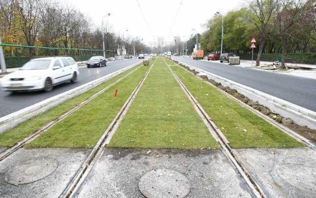 Gazon între şinele de tramvai şi staţii distruse înainte de inaugurare