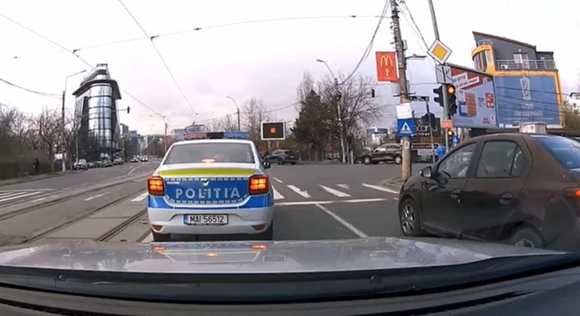 0O maşină de Poliţie a fost surprinsă în Bucureşti în timp ce trece pe roşu într-o intersecţie circulată, iar ulterior depăşeşte şmechereşte o coloană de maşini.