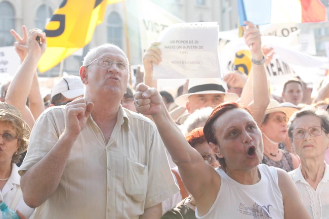 UPDATE 19.50 Fostul premier Mihai Răzvan Ungureanu a făcut un apel la mobilizarea cetăţenilor, cărora le-a cerut să nu mai tacă, să fie "supăraţi" şi să protesteze în fiecare zi, el fiind aclamat de manifestanţi.