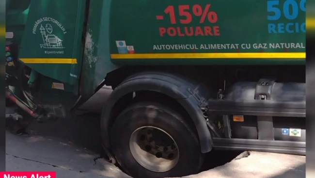 Imaginile martorilor prezintă cum roţile din spate ale camionului de salubrizare au rămas scufundate într-o groapă creată în asfalt.