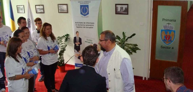 În baza informaţiilor asimilate până în prezent, elevi din liceele Sectorului 4, însoţiţi de poliţişti locali şi de reprezentanţi ai D.G.A., au împărţit, ieri, funcţionarilor din primărie pliante informative. Modalitatea folosită a fost făcută cu intenţia de a atrage atenţia asupra riscurilor pe care le comportă săvârşirea actelor de corupţie instituţională.