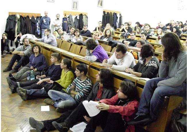 UPDATE 22.25: Potrrivit unei postări făcute pe pagina grupului de discuţii deschis pe facebook, în amfiteatru mai sunt doar aproximativ 40 de studenţi.