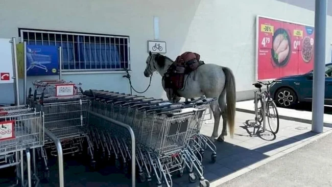 Imaginea cu calul așteptând, liniștit, în fața magazinului, a devenit virală și a generat o mulțime de comentarii.
