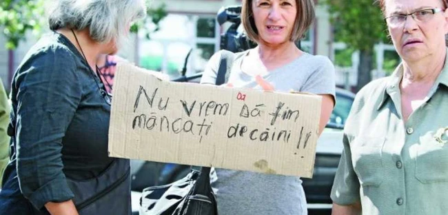 UPDATE 12.53 La protest şi-a făcut apariţia un bărbat care ţine doi câini comunitari în lesă. Acesta a trecut să o felicite pe Nadine pentru acţiunea organizată, dar în câteva clipe a fost rugat de un jandarm să părsească zona în care protestatarii îşi strigă nemuţumirea.