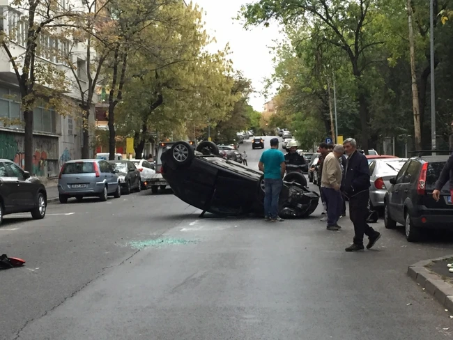 Video VIDEO Accident spectaculos de maşină lângă parcul Cişmigiu. O şoferiţă s-a răsturnat cu autoturismul pe carosabil