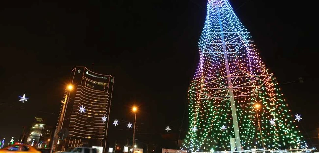 În rondul de la Universitate tronează un alt brad. Însă acesta este făcut în totalitate din mii şi mii de beculeţe multicolore.