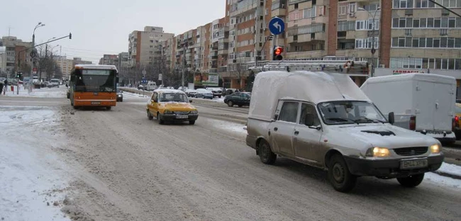 Gheaţă, zăpadă, circulaţie cu 20 de kilometri la oră, derapări, claxoane şi nervi întinşi la maxim. Asta este atmosfera în oraş chiar dacă nu a nins decât cîteva ore iar zăpada nu a fost în cantitate mare. Nici urmă de nisip sau soluţie care să înmoaie ghata de pe carosabil.