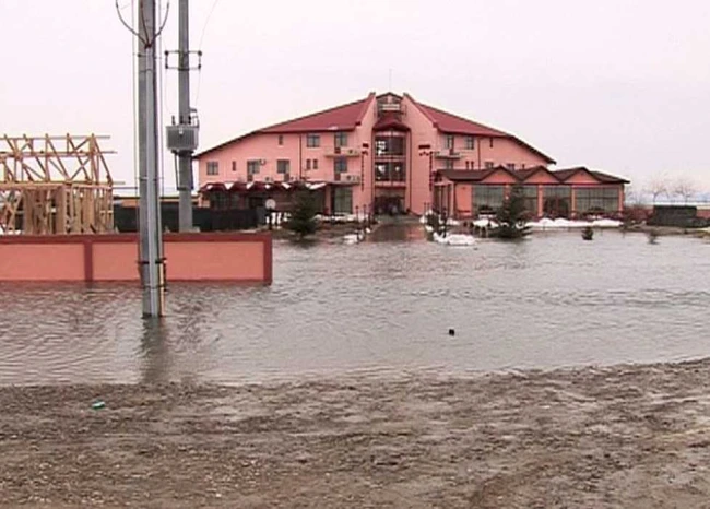 Apa acumulată pe câmp din cauza topirii bruşte a zăpezii şi-a făcut vad şi a năvălit de jur împrejurul complexului.