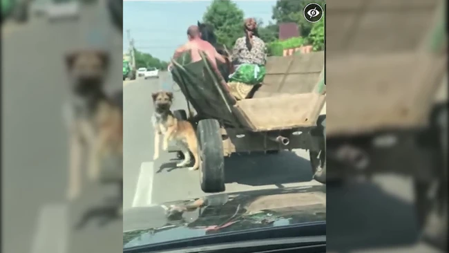 Animalul, care este legat de atelajul aflat în mers, păşeşte doar cu picioarele din spate, fiind atârnat parţial într-un laţ. Nu se ştie cât durează drumul chinuitor al căţelului.