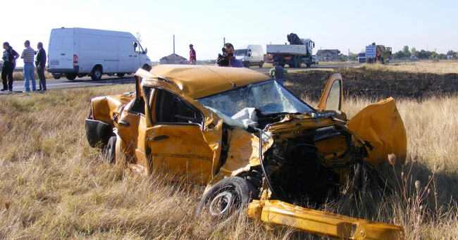 Cascadorie pe DN2E85: Un Logan a fost proiectat câteva zeci de metri în aer în urma impactului violent cu un TIR