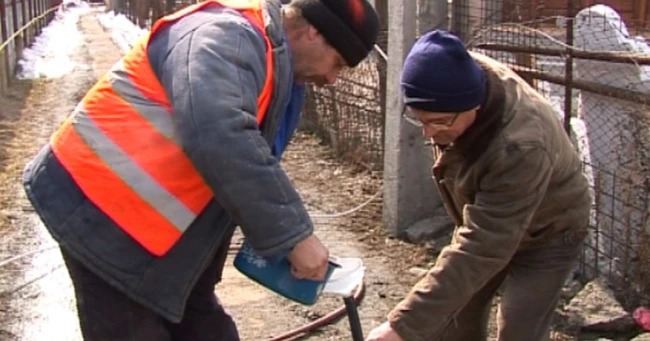 În lipsa unor echipamente speciale care să înlăture gheaţa formată pe ţevi, muncitorii folosesc pâlnia şi apa cu sare.