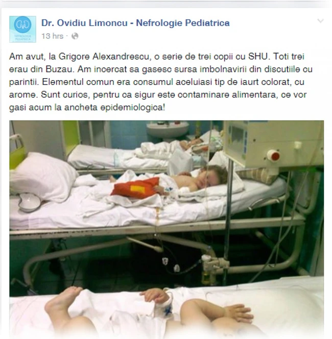 „Am avut, la Grigore Alexandrescu, o serie de trei copii cu SHU. Toţi trei erau din Buzău. Am încercat să găsesc sursa îmbolnăvirii din discuţiile cu părinţii. Elementul comun era consumul aceluiaşi tip de iaurt colorat, cu arome. Sunt curios, pentru că sigur este contaminare alimentară, ce vor găsi acum la anchetă epidemiologică!”, a scris Ovidiu Limoncu pe Facebook.