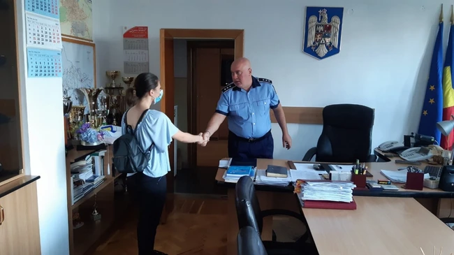 Andreea Teodora Şerban a fost felicitată de şeful IPJ Buzău, de la care a primit în dar, într-o tocă, flori albastre ca uniforma de poliţist, o şapcă şi un tricou de colecţie, inscripţionate cu sigla Poliţiei.