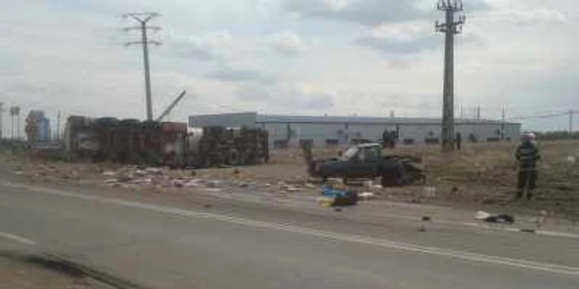 Cisterna încărcată cu 25.000 de litri de benzină şi 8.000 de litri de motorină s-a răstunat în urma impactului cu o autoutilitară Dacia Papuc care nu s-a asigurat la ieşirea din benzinărie. Cisterna este răsturnată în afara şoselei, la circa 20 de metri de benzinărie, iar autoutilitara este grav avariată.