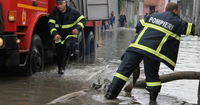 La Grebănu, patru case au fost inundate, opt curţi şi trei beciuri în timp ce o persoană imobilizată a fost evacuată din locuinţa inundată.