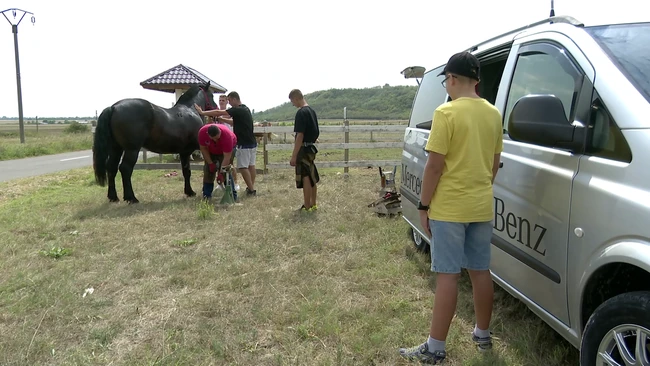 „O să trebuiască să-i dăm potcoavele jos, potcoavele vechi. Pentru mine e ușor, pentru că fac asta zilnic. Mai depinde și de cal. După ce am ales potcoava potrivită, urmează să fie prinsă în cuie. Această etapă trebuie făcută cu grijă pentru a nu răni animalul”, explică tânărul potcovar.