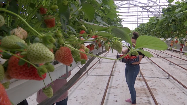 Primele fructe s-au copt încă din luna aprilie, iar căpșunile sunt culese, cu grijă, fruct cu fruct. Totul merge foarte repede pentru că plantele sunt cultivate la o înălțime de un metru și jumătate, perfect pentru culegătorii care nu mai sunt nevoiți să se aplece pentru a aduna fructele.