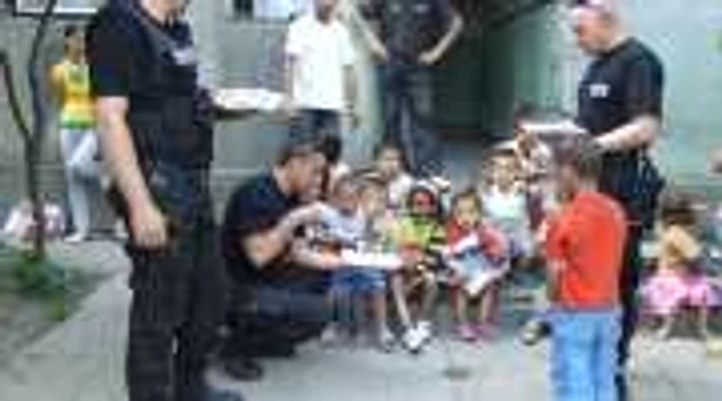 O echipă de intervenţie rapidă din cadrul Poliţiei Locale le-au făcut daruri micuţilor care au sărbătorit pentru prima dată în viaţa Ziua Copilului.