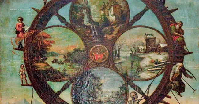 Roata are mai multe segmente care înfăţişează omul în diferite etape ale vieţii. Punctul de interes porneşte din stânga tabloului spre dreapta, privitorul având posibilitatea să urmărească toate treptele existenţei: copil de 7 ani, tânăr de 28 de ani, matur de 40 de ani, bătrân de 80, pentru ca în final să ajungă în pământul din care a fost făcut.