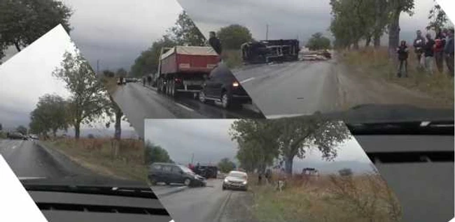 VIDEO Accident cu doi răniţi, după ce un camion cu lemne s-a răsturnat în urma coliziunii cu un Logan