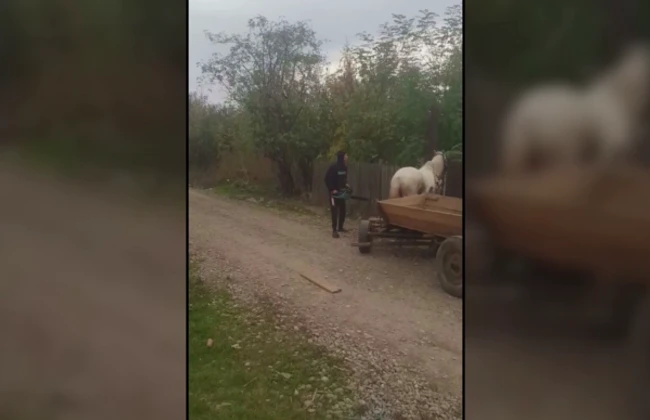 Pe înregistrarea efectuată de un localnic din comuna buzoiană Brădeanu se vede cum proprietarul animalului porneşte o drujbă şi, cu ea pornită, atinge calul pentru a-l determina să scoată căruţa din şanţul în care rămăsese înţepenită.