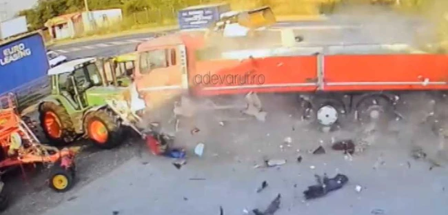 A fost momentul în care TIR-ul scăpat de sub control a intrat pe contrasens, tăind şoseaua europeană în diagonală, a pus la pământ doi stâlpi de beton, a rupt un gard, a traversat o curte liberă şi a ajuns în incinta unei societăţi comerciale de la intrarea în Gura Câlnăului, unde a făcut praf mai multe utilaje agricole.