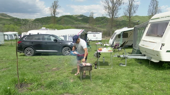 În campingul de rulote de la Vulcanii Noroioşi, turiştii au prins poftă de petrece spre orele amiezii, după ce au vizitat împrejurimile. Grătarele au fost aprinse şi ele, unul după altul, pentru a frige în primul rând mititeii, vedetele zilei.