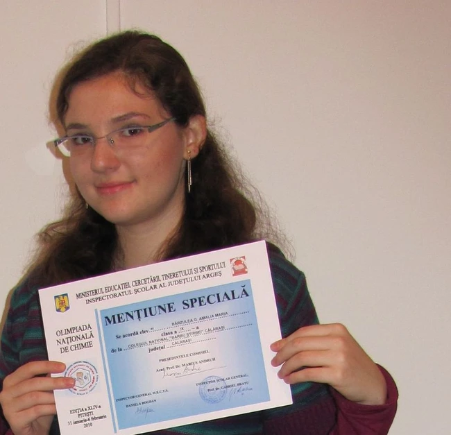 Tânăra a încheiat toţi anii de studiu cu media 10 şi spune că se învaţă să aibă numai medii bune pentru a fi admisă la o facultate de chimie în America sau Anglia. În clasa a -VII-a şi a -VIII-a a fost prima pe judeţ la matematică şi chimie, iar în clasa a -IX-a ieşit pe locul II pe judeţ la olimpiada de chimie, iar la faza naţională a obţinut o menţiune specială. Anul trecut, la olimpida de astrofizică a luat locul II, iar la olimpiada de fizică a luat menţiune.