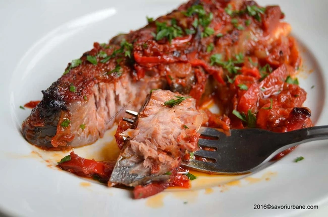 Se curăţă ceapa, se taie peştişori. Se toarnă ulei într-o tavă încăpătoare, se pune ceapa pe foc mic, la înmuiat. Crapul, grijit bine, curăţat de solzi şi tăiat bucăţi, se freacă cu sare şi se unge cu ulei, apoi se aşază în tavă peste stratul gros şi transparent de ceapă. Se presară piper cât vă place. Se taie roşiile felii, se pun pe unde e loc în tavă, şi pe peşte, şi pe lângă el, cu foile de dafin. Vinul se toarnă acum, pe lângă uleiul dat în undă, pentru a da o aromă deosebită preparatului. În cuptorul domolit nu va sta mai mult de un ceas, să scadă sosul şi să se rumenească uşor carnea şi roşiile . Se presară pătrunjel, e moale, e dezmierdat de parfumuri, e acrişor, deci e plachie.
