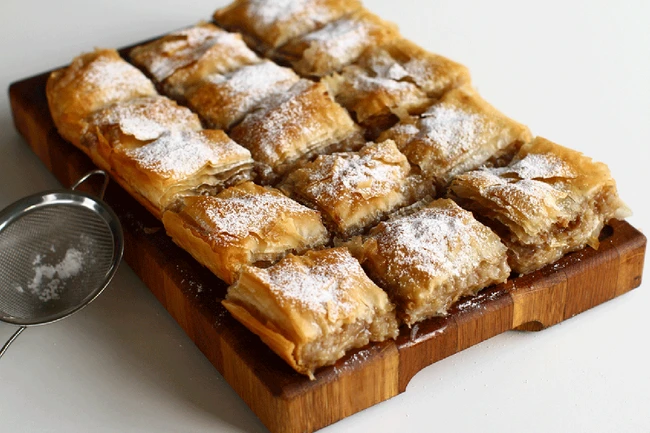 Între fiecare întinsoare, repaus de un sfert de oră. Când e gata, adică după ultima întinsoare, se coace jumătate din aluat în tavă şi se presoară cu posmag fin, de cozonac sau chifle. Când e pe jumătate copt, se pun merele peste aluat şi apoi jumătatea rămasă. Se pune iar la copt. Când e rumenit, se presară cu zahăr pudră şi se mai bune (un pic) la cuptor. Apoi, se taie după normele obişnuite. Aluatul se lucrează la rece. Se coace la foc potrivit.
