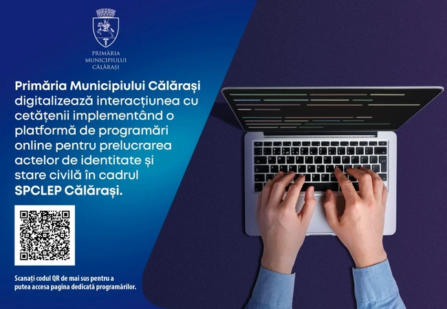 Începând de ieri, 4 octombrie, Primăria Municipiului Călăraşi pune la dispoziţia cetăţenilor o platformă de programări online pentru prelucrarea actelor de identitate şi stare civilă în cadrul SPCLEP Călăraşi.