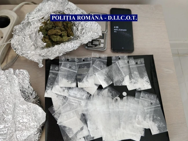 La percheziţii au fost descoperite şi ridicate 30 de grame de cannabis, 14 comprimate de metadonă, 17 doze de cannabis, 50 de pliculeţe cu cocaină, 1 grinder, 1 cântar de precizie, 4 telefoane mobile, 300 de euro şi 1.350 de lei.
