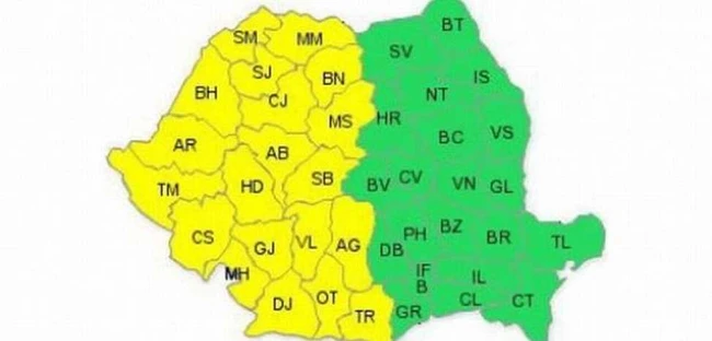 Potrivit avertizării transmise de Administraţia Naţională de Meteorologie, de miercuri, ora 20.00, şi până joi, ora 12.00, în jumătatea de vest a ţării vor fi averse cu caracter torenţial, descărcări electrice, intensificări ale vântului cu aspect de vijelie şi izolat căderi de grindină, iar cantităţile de apă vor depăşi local 25 de litri pe metru pătrat.