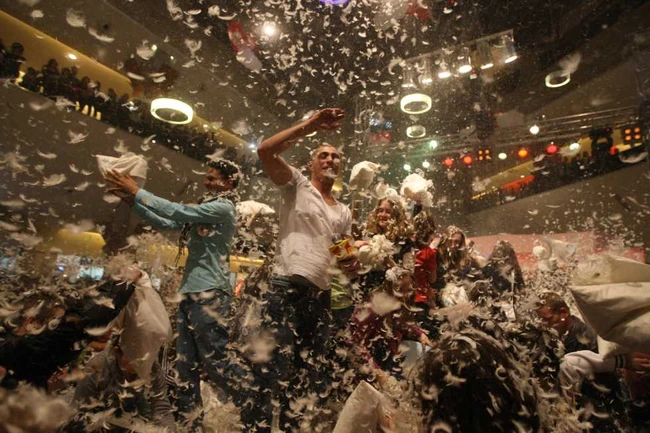 Distracţia a început la mall-ul clujean ieri, de la ora 16.00. „Burlacul" Vladimir Drăghia a dat startul evenimentului în care s-au folosit peste 3.000 de perne ce au fost aruncate în aer. Amuzanta bătaie cu perne a fost transmisă live.