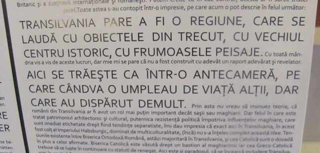 Dintre imaginile expuse (vezi pozele din galeria din dreapta) au fost fotografii ale unei „porţi“ maramureşene, ale unei coperte de carte cu cântece pentru studenţi, cântece compuse de Ciprian Porumbescu, ale unei plăci comemorative a lui George Enescu de pe o stradă din Viena.