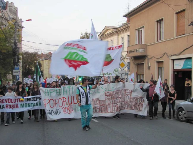 Manifestanţii s-au adunat, duminică, în jurul orei 17.30, în Piaţa Unirii din Cluj-Napoca, cu pancarte pe care erau scrise mesajele "Roşia Montană e începutul Revoluţiei", "Ministerul Mediului este sclavul Goldului", "Nu contează caracterul, când ai braţul ca minerul".