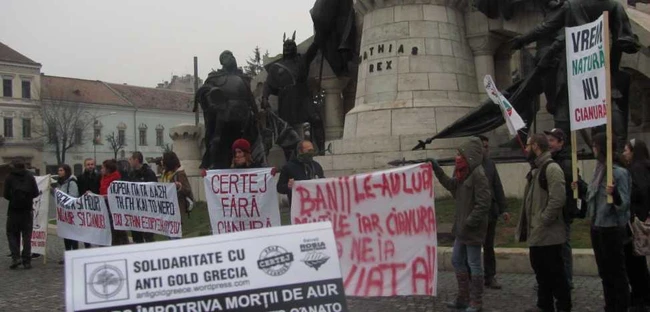 Aproximativ 30 de clujeni, simpatizanţi Roşia Montană organizaţi într-un grup numit „Tinerii mânioşi“, au ieşit sâmbătă, după-amiaza, în Piaţa Unirii, în faţa complexului statuar Matia Corvinul, şi au cerut, ca şi grecii din Atena, Salonic şi Halkidiki, să nu se înceapă exploatarea auriferă în Halkidiki.