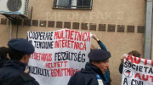 Cei zece tineri au mers pe trotuarul din faţa Liceului Teologic Reformat din Cluj-Napoca în momentul în care a ajuns acolo maşina premierului Ungariei, Viktor Orban, afişând două bannere, în limbile română şi maghiară, cu mesaje de cooperare multietnică. Pe cele două bannere scria: "Cooperare multietnică, nu tensiune interetnică" şi "Autonomia societăţii civile", relatează Mediafax. Alex Boguş, unul dintre cei zece tineri, a declarat că gestul lor este unul de protest faţă de prezenţa la Cluj a lui Viktor Orban, pe care îl consideră un autocrat şi un dictator. "Suntem un grup de cetăţeni nemulţumiţi şi îngrijoraţi. Inaugurarea liceului renovat din Cluj-Napoca este umbrită de prezenţa lui Viktor Orban, un personaj autocrat şi dictator. Direcţia pe care o ia Guvernul Orban este autoritară şi dictatorială şi merge spre extrema dreaptă. Vrem să tragem un semnal de alarmă aici, în Transilvania, unde trăiesc români şi maghiari, care vor cooperare interetnică, şi nu tensiuni", a spus Boguş. Potrivit acestuia, printre cei zece tineri se află români, maghiari şi francezi. Tinerii au fost înconjuraţi de jandarmi şi au rămas pe trotuarul din faţa şcolii.