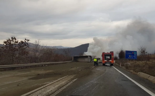 Un camion s-a răsturnat şi a luat foc pe DN1 E60. Traficul este blocat pe ambele sensuri în apropierea localităţii Dumbrava, în judeţul Cluj