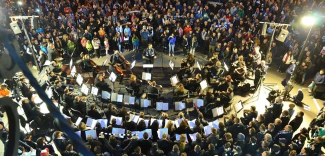 VIDEO Cântecele galeriei Universităţii Cluj, interpretate live, în faţa sediului UBB de o orchestră simfonică