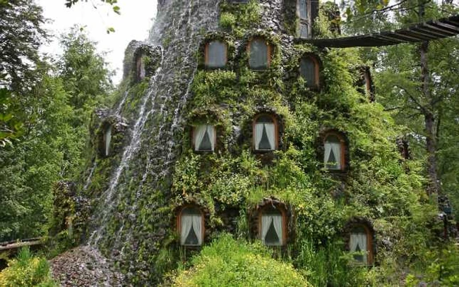 În Rezervaţia Naturală Huilo Huilo din Chile, parte a patrimoniului UNESCO, turiştii pot face drumeţii şi se pot relaxa într-un decor de poveste: Hotelul Muntele Magic, pe numele oficial Montana Magica Lodge. Construcţia are forma unui con vulcanic, iar de sus nu curge lavă, ci apa e cea ce scaldă pietrele şi lemnul din care a fost clădit neobişnuitul hotel.