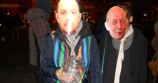 VIDEO Susţinătorii clujeni ai Roşiei Montane, deghizaţi în Băsescu, Boc şi Kelemen, au împărţit „cianură“ în Piaţa Unirii