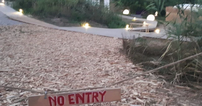 Plaja Cochilia, situată la extremitatea falezei Tuzla, era sâmbătă seara închisă turiştilor. O barieră oprea accesul autoturismelor de pe faleză pe plajă, iar la intrare, un anunţ legat de o sfoară interzicea accesul oricărui vizitator în mica oază. „No entry. Tabără de creaţie. Circuit închis“, scria pe o plăcuţă. De la distanţă am putut să vedem mai multe containere vopsite în culoare albastru deschis, cu alei luminate.