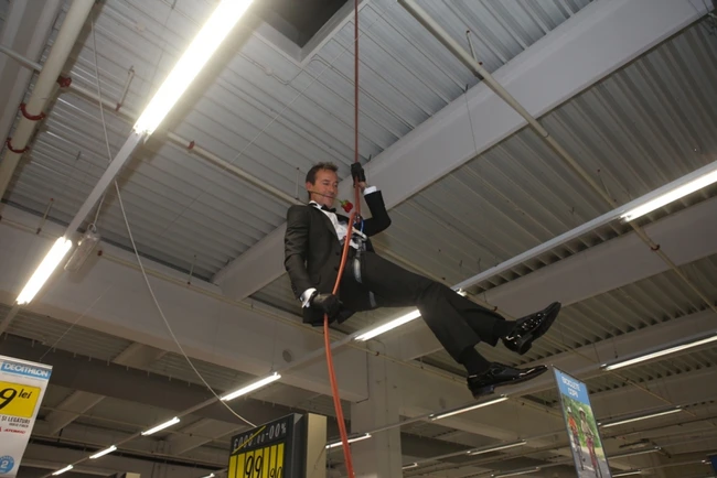 Primarul şi-a făcut apariţia ca în filmele de acţiune. El a coborât pe o frânghie, prin acoperişul magazinului. Era în costum negru, gen agentul 007, cu papion şi mănuşi negre de piele, iar între dinţi ţinea un trandafir roşu. Pe muzica din James Bond, Mazăre a aterizat în mijlocul asistenţei, în aplauze.