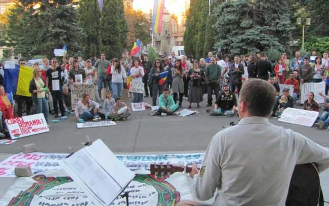 0Chitară, violoncel, fluiere, scandări şi „Gălăgieee“. Protestatarii strânşi în faţa Prefecturii Constanţa au manifestat paşnic duminică, 15 septembrie, împotriva exploatării cu cianuri de la Roşia Montană, precum şi a celei prin fracturare hidraulică din Dobrogea.
